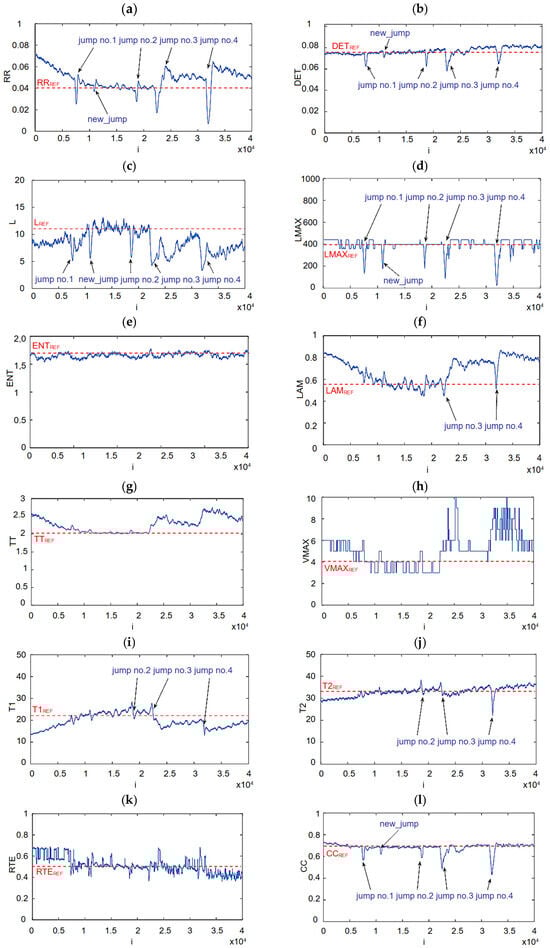 The RTE index (Figure 17k) changes its value at a similar level across the entire analyzed range, making it difficult to detect peaks using this index. The last recurrence indicator maintains a fairly steady level around the reference value (CCREF = 0.7, Figure 17l). Only at the peak locations does its value significantly drop. Therefore, it is one of the more promising indicators for detecting sudden changes in dynamics.