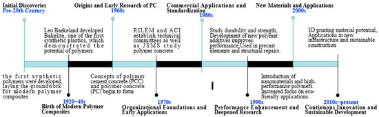 The developmental timeline of polymer concrete.