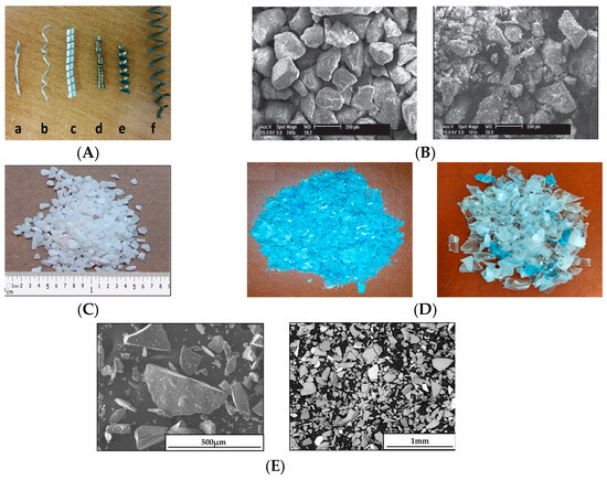Some of the common aggregates of PC. (A) a–f shows titanium; aluminum fine chip; aluminum medium chip; and steel fine, medium, and thick chip [17]. (B) SEM micrographs of crushed basalt aggregate and silica sand aggregates [37]. (C) Marble particles [36]. (D) Fine recycled PET and coarse recycled PET [16]. (E) Micrographs of coarse RGA and fine RGA [38].