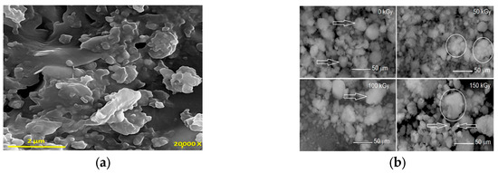 The common nanofillers of PC. (a) SEM micrograph of BFPC-clay2 sample [13]. (b) SEM images of nanosilica after irradiation [57].