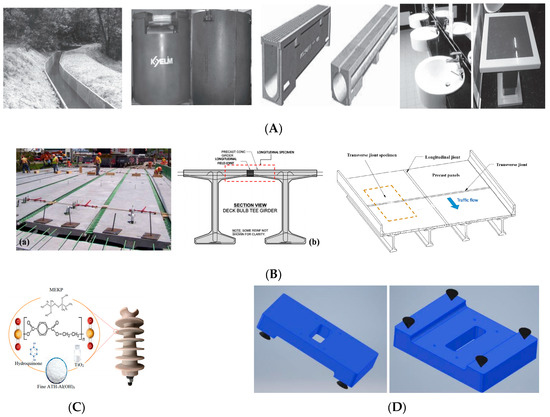 Today, the use of PCs is increasing rapidly in many industries. According to recent research by Global Market Insights, the polymer concrete market is expected to surpass a market value of over USD 750 million by the year 2025 while registering a CAGR of 7.9% during the forecast 2022–2030 [89]. Polymer concrete was developed as a replacement for cement concrete in some specific applications and was used as early as 1958 in the US to produce building cladding. It was later implemented as an alternative to other substances, such as metal alloys; for example, cast iron for machine beds. Due to fast curing time being one of the main advantages of PCs, polymer concrete was widely used for repair, strengthening, and protection, such as maintenance applications like highway pavement, bridge overlay, and floor covering. Precast polymer concrete has been used to produce a variety of products like acid tanks, manholes, drains, highway median barriers, and so forth. According to the book [65], the applications can be classified as electrical and communication, overlay and coatings, repair material, water supply and drainage, agricultural irrigation facilities, container, architectural use, building and construction, machine parts, high-pressure and -temperature media, hydraulic structures, transportation, and 3D printers. Some photos of the applications of PC are shown in Figure 8.