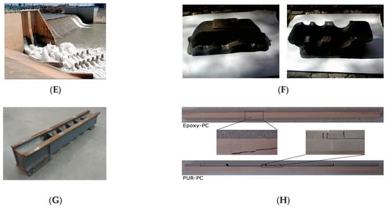 Some photos of the applications of PC. (A) Flume, container, pre-slope trench, and artificial marble products [80]. (B) Poly methyl methacrylate polymer concrete for bridge deck bulb tee girder longitudinal field joints, (a) construction of a DBT girders bridge of Route 31 Bridge in Lyons (b) schematic of field joints and test specimen [90,91]. (C) PC line-post insulators [92]. (D) Machine tool bed [93]. (E) PC use in hydraulics [94]. (F) Manufacture of gear cases and pumps [95]. (G) Body of lath [96]. (H) Timber concrete composites [97].