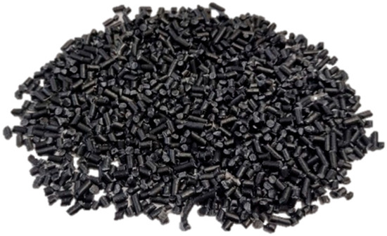 For the extrusion process, a single-screw extruder from THERMO SCIENTIFIC, model HAAKE POLYLAB QC (Thermo Fisher, Waltham, MA, USA), with four heating zones, was used. The homogenized and mixed sample was fed into the extruder using the following parameters: (i) screw rotation speed of 20 rpm; (ii) temperature profile set to 160 °C for heating zones 1, 2, and 3; and (iii) 170 °C for zone 4 (exit or die zone). After processing, the filaments were pelletized (Figure 1) using an Axplástico laboratory pelletizer (AXPlástico, Diadema, Brazil).