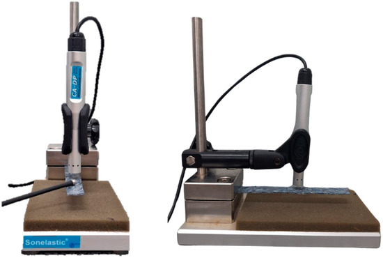 The ultrasonic wave propagation test was conducted using the Ultrasonic Timer FAKOPP equipment (Fakopp, Sopron, Hungary), in accordance with the guidelines established by the NBR 58000 (2007) standard [20]. For the experiment, two piezoelectric transducers, model SD 33 (Fakopp, Sopron, Hungary), were employed. These transducers were coupled to the cross-sections of the specimen using a clamp, operating at a frequency of 90 kHz.
