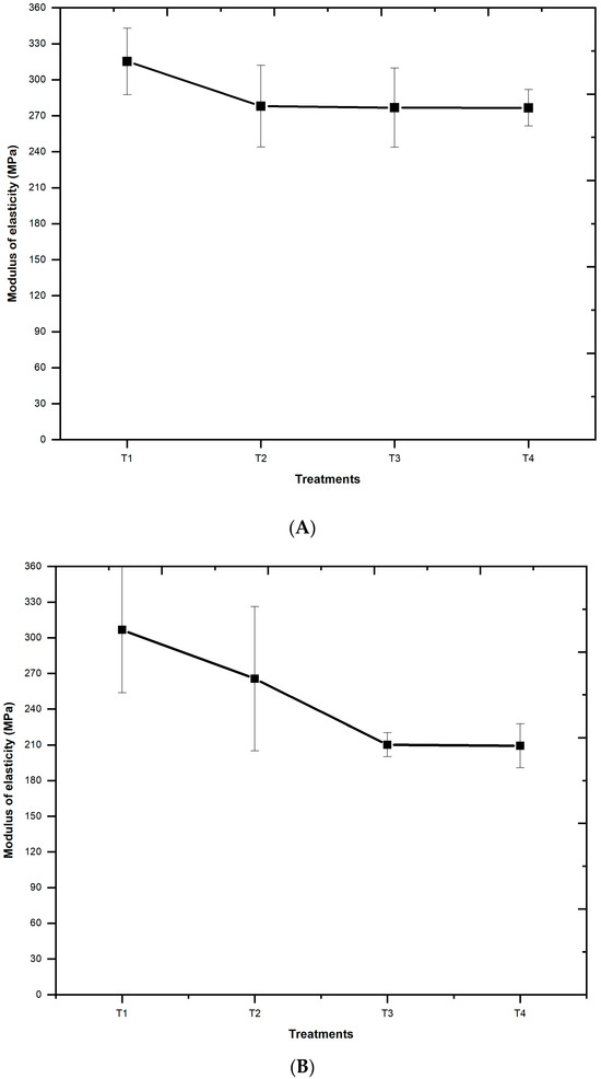Trend graph of the variation of static modulus of elasticity (MOE) for composites produced by the methods of: (A) pressing and (B) extrusion.