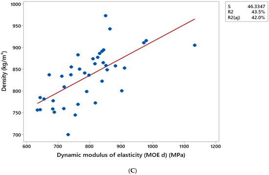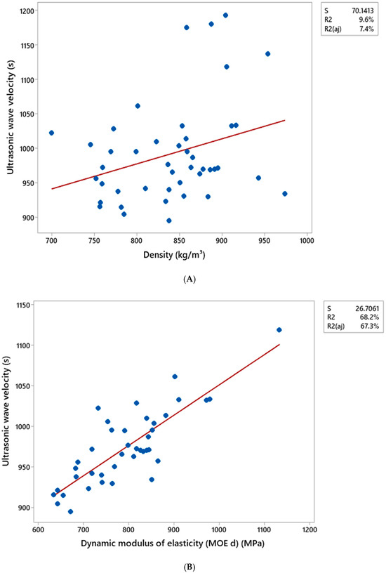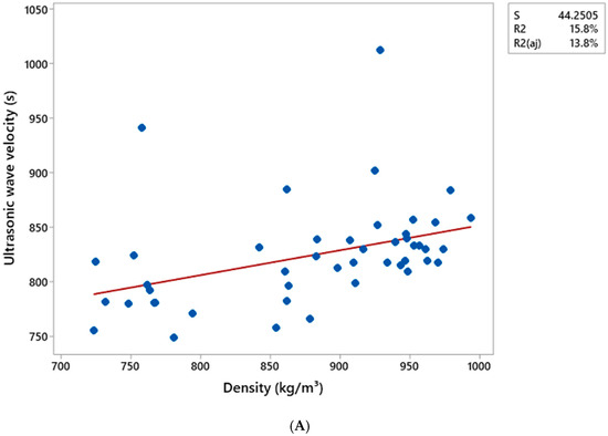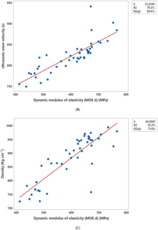 Figure 7 and Figure 8 display the scatter plots for the combinations between the variable’s density (kg cm−3), ultrasonic wave speed (s), and elastic modulus (MPa), along with their respective coefficients of determination (R2). The letters A, B, and C represent the relationships between ultrasonic wave speed and density, ultrasonic wave speed and elastic modulus, and density and elastic modulus, respectively.