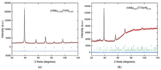 X-ray diffraction patterns and results of refinements for the (a) (VNb)0.753(TiHf)0.247 and (b) (VNb)0.67(TiTbHf)0.33 alloys. Red circles and gray lines represent the experimental points and the theoretical curves, respectively. Blue lines show a difference between the two, and green vertical dashes indicate positions of the Bragg reflections for the identified phases. In panel (b), the upper dashes correspond to bcc phase, the middle to pure Tb precipitates, and the bottom to Tb2O3.