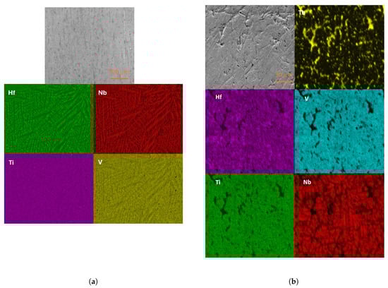 SEM micrographs with EDXS elemental mapping superimposed on the sample surface of the (a) (VNb)0.753(TiHf)0.247 and (b) (VNb)0.67(TiTbHf)0.33 alloys.