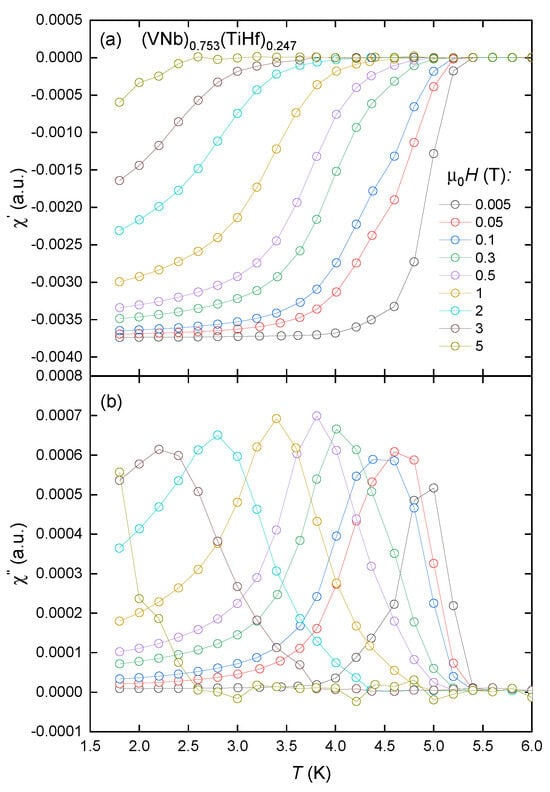 Real (a) and imaginary (b) parts of AC susceptibility measured for the (VNb)0.753(TiHf)0.247 alloy in the nominal applied magnetic fields . Hollow circles represent the measured points, and solid lines serve as a visual guide.