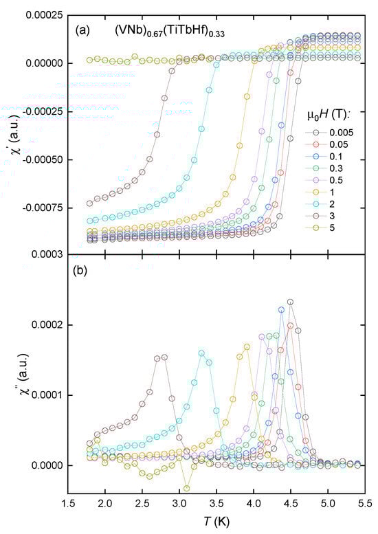 Real (a) and imaginary (b) parts of AC susceptibility measured for the (VNb)0.67(TiTbHf)0.33 alloy in the nominal applied magnetic fields . Hollow circles represent the measured points, and solid lines serve as a visual guide.