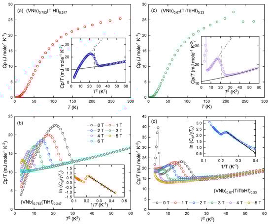 (a) Temperature variation of specific heat of (VNb)0.753(TiHf)0.247; the insert shows T() measured in nominal zero magnetic field, and the solid curve depicts fit of Equation (1) to the experimental data together with dashed lines indicating the estimated normalized jump and . (b) vs. measured in various external magnetic fields up to 6 T for (VNb)0.753(TiHf)0.247 sample; the inset shows as a function of inverse temperature measured in a nominal zero field, and the straight solid line is a fit of Equation (6) to the experimental data. Panels (c,d) display analogous analysis for the (VNb)0.67(TiTbHf)0.33 alloy.
