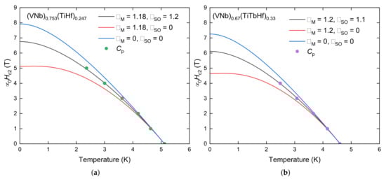 Upper critical fields of (a) (VNb)0.753(TiHf)0.247 and (b) (VNb)0.67(TiTbHf)0.33 as a function of temperature, derived from specific heat data. The lines depict the simulated WHH curves (Equation (9)).