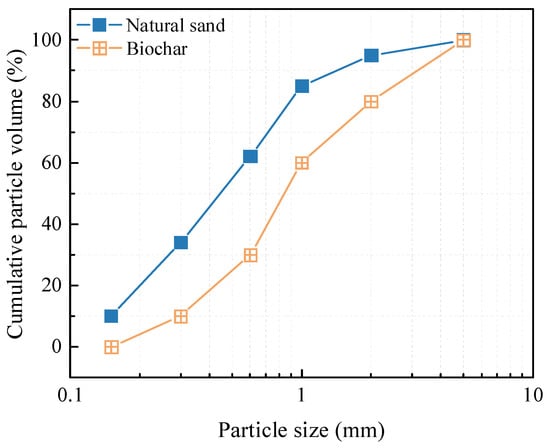 The primary cementitious material was ordinary Portland cement (OPC) of class 42.5R from China Southern Cement Co., LTD, Shanghai, China which met the GB 175-2007 standard [17]. Locally sourced natural river sand (NS), categorized as Zone II was utilized as the fine aggregate. The biochar used in this study was produced from the pyrolysis of waste bamboo (BC) for 2 h at 500~700 °C using a warming speed of 10 °C m−1 under a limited supply of air [18]. The BC and NS were evaluated in accordance with the basic performance test methods of the (GB/T14684-2022) standard [19]. The particle size distribution of the biochar was 0–5 mm, as shown in Figure 1. Table 1 shows the properties of the NS and BC. Compared with the NS, the apparent density of the BC was lower than that of the NS, but its water absorption was much greater than that of the NS. Figure 2 displays the appearance of the natural river sand and biochar. From the SEM image, it can be observed that the BC possessed an irregular sawtooth shape and showed a narrow lotus root shape. The NS had a regular shape with a smooth surface devoid of obvious pores. Table 2 provides an overview of the findings.