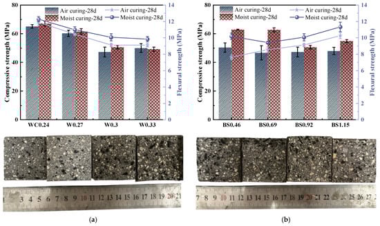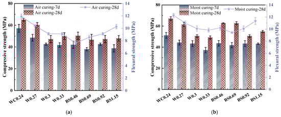 Mechanical strength of biochar mortar. (a) Different W/C. (b) Different S/B.