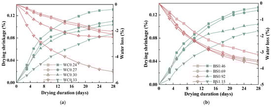 Drying shrinkage and water loss of biochar mortars. (a) W/C. (b) S/B.