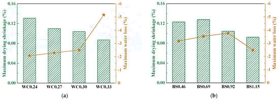 Maximum drying shrinkage and water loss. (a) W/C. (b) S/B.