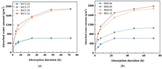 The water absorption curves of biochar mortar. (a) W/C. (b) S/B.