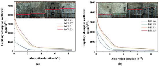 Figure 8a presents the variation in capillary absorption coefficient of the biochar mortars over time. It is shown that both the initial Cw and time-varying Cw generally increased with increasing W/C and S/B ratios. The immersion depth of biochar mortar increases significantly with increases in the W/C and S/B ratios. Moreover, the Cw of the different mortars only differed significantly in the first few hours, and their final coefficients and water ingress depth were similar.