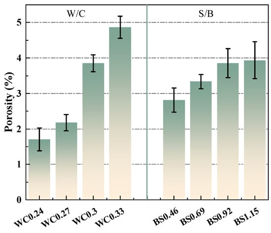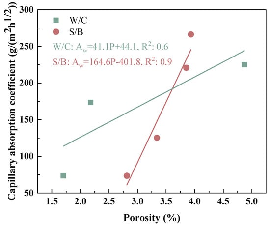 Figure 9 shows the total porosity of the biochar mortars. As a whole, the porosity increased with the increase in W/C and S/B ratio, which is consistent with the results of mechanical strength in Section 3.1. Especially when the water–cement ratio exceeds 0.3, the porosity of the biochar mortar increases sharply. For different S/B ratios, the overall porosity of the mortar increased due to the introduction of more pores through the increase in biochar dosage. Nonetheless, with the increment of the S/W ratio, the progressive increase in the porosity of the mortar becomes less conspicuous. This means that the addition of an appropriate amount of biochar can form a continuous gradation with natural river sand, making the mortar denser and more favorable to the development of mortar strength [48]. It is worth noting that the effect of the water–cement ratio on porosity is more significant than that of the sand–cement ratio, which provides a favorable reference for the design of the proportion of biochar mortar. By correlating the water transport behavior of the biochar mortar, Figure 10 further illustrates that the capillary absorption coefficient is proportional to the total porosity.