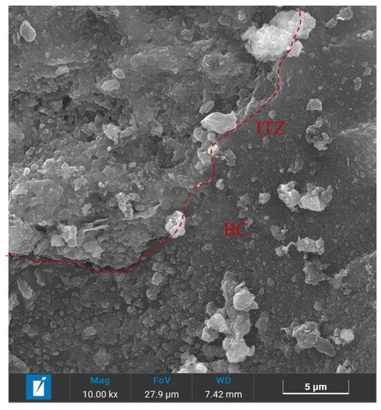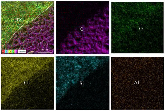Figure 11 reveals the partial bonding characteristics of the biochar to the matrix. The BSEM images provide valuable insights for observing the morphology and composition characteristics of relevant regions. Compositional information (i.e., average atomic number) of the regions of interest can be analyzed by EDX surface scanning, where brighter regions indicate heavier or denser components (i.e., higher average atomic numbers) [49]. A clear interfacial transition zone (ITZ) was observed in the specimens of biochar mortar. This is because the loose and porous surface of the biochar provided nucleation sites for the hydration reaction of the Portland cement, resulting in the formation of a denser ITZ structure [29,47]. Figure 12 shows that the brightest region corresponds to calcium hydroxide (CH), while the gray region between the biochar and CH represents a layer of C-S-H gel. Additionally, fewer microcracks at the ITZ can be seen, suggesting improved mechanical interlocking and adhesion. This is in agreement with the findings of Zhu et al. [50]. This is because the calcium ions in the cement can act as a bridge to the ITZ and provide a nucleation site for the growth of CH. Consequently, a distinctive bonding mechanism is established between the biochar and the cement matrix via calcium hydroxide (CH) or a stratum of calcium-silicate-hydrate (C-S-H) gel [50].