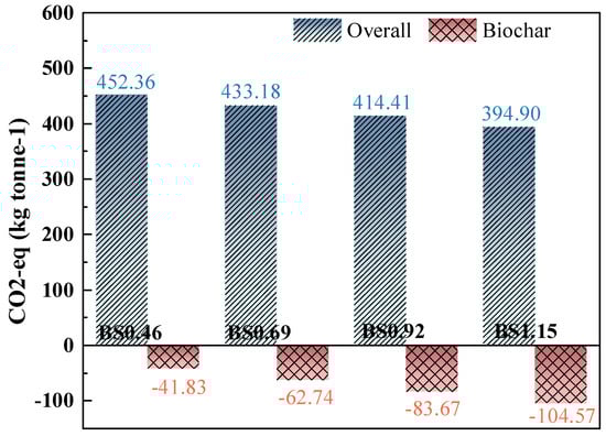 The CO2 emissions of the biochar mortars are demonstrated in Figure 13. The results demonstrated that the incorporation of biochar significantly reduced CO2 emissions, which is expected to contribute to the production of low-carbon mortar. As we can see from Table 5, cement releases large amounts of carbon dioxide during production and use, which is not conducive to sustainable development. The incorporation of biocarbon facilitates the development of low-carbon mortar. The CO2 emissions of the biochar mortars decreased significantly with the increase in biochar content. When the sand-to-cement ratio reaches 1.15, biochar reduces CO2 emissions by 104.57 kg. This results in an 87.3% reduction in overall mortar carbon emissions compared to BS1.15. Therefore, this result is in contrast to earlier studies, where the replacement of natural aggregates with biochar produced CO2 emissions that were between 6.2% [32] and 46.6% [52] lower than ordinary concrete/mortars. Therefore, biochar mortar shows good CO2 sequestration potential.