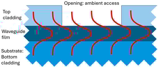 A schematic of the side view of a waveguide with a sensing opening in the top cladding layer, allowing the ambient environment to interact with a light signal guided by the waveguide.