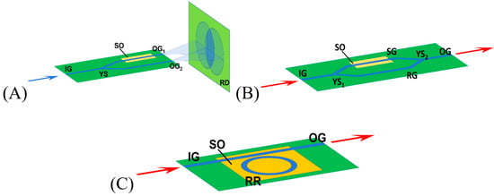 Schematic representations of exemplary layouts of integrated photonics devices for sensory applications: (A) Young interferometer; (B) Mach–Zehnder interferometer; (C) ring resonator.