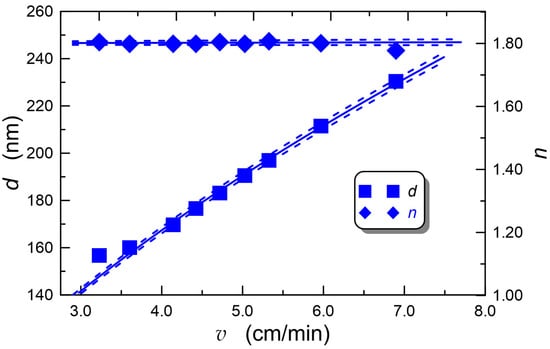 As shown in Figure 4, it is possible to precisely control the WG film thickness by properly adjusting the withdrawal speed of the substrate from the sol. The experimental dependence d = d(v) was approximated by the function d = Aξvα + B, where a = 0.5740 ± 0.0018, A = (76.3 ± 0.2) nm, and B = (−1.69 ± 0.49) nm. Additionally, the experimental dependence of the refractive index n on the withdrawal speed was approximated by the linear function n = av + n0, obtaining n0 = 1.7947 ± 0.0012 and a = (0.000531 ± 0.000254) min/cm. The mentioned process does not affect the film’s refractive index, which is controlled by adjusting the stoichiometric proportions of silica and titania compounds in the sol. This provides flexibility and precise adjustment of the WG film parameters, allowing for the fabrication of structures optimized for the required application, e.g., structures optimized to have maximum sensitivity to ambient refractive index changes.