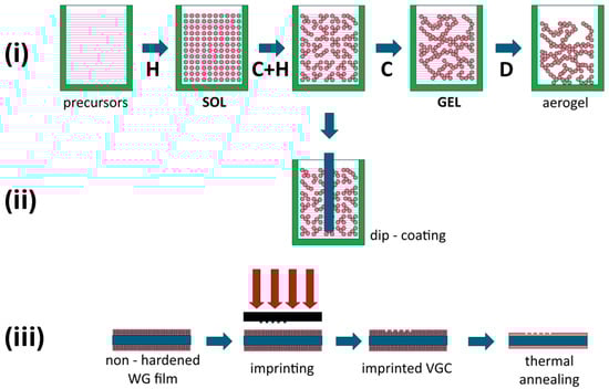 Schematic representation of fabrication process for SiOX:TiOY directly patterned VGCs: (i) sol formation and ageing process; (ii) dip-coating deposition; (iii) imprinting process. Acronyms: H—hydrolysis; C—condensation; D—drying.