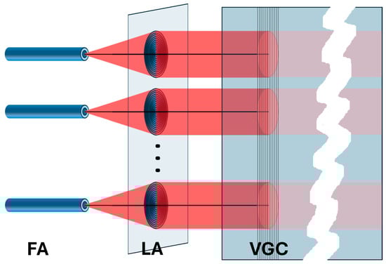 A schematic of the multichannel coupling scheme via a single large-area VGC. FA—optical fiber array; LA—microlens array; VGC—vertical grating coupler imprinted on SiOX:TiOY waveguide film.