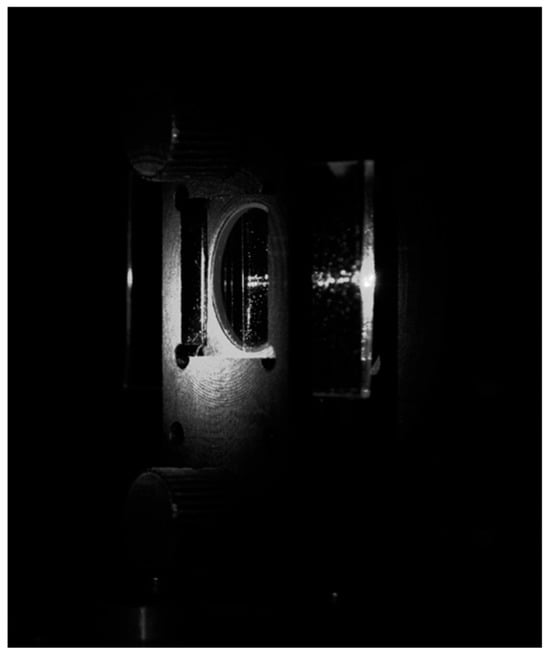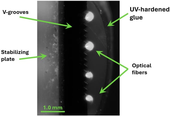 To implement and demonstrate the coupling scheme depicted in Figure 6, a set of quasi-point sources emitting light in the same direction is needed, with a set of lenses having an appropriate focal length and geometry aligned adequately with the point sources. In our case, the optical signal was delivered via four polarization-maintaining (PM) single-mode optical fibers optimized for operation at wavelengths corresponding to the red part of the spectrum. The fibers were attached to a V-groove array. The exploited array had a pitch of 250 µm. The positions of the fiber cores in the V-grooves were measured with sub-micrometer precision to identify the exact fiber positions to which lenses in the lens array were adjusted. A photograph of the assembled optical fiber array in a V-groove is shown in Figure 7. For better visibility of the fibers, the photograph was taken with the fibers’ outputs illuminated by the propagating optical signals.
