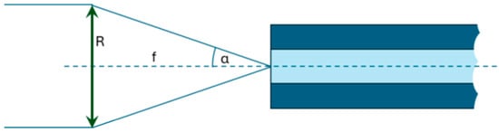 The implementation work began by determining the physical parameters of the optical system under study. The considered circumstances were the working wavelength of the system (λ) set to λ = 635 nm and the parameters of the optical fibers in the fiber array. The chosen fibers had a numerical aperture (NA) equal to 0.12. Consequently, half the acceptance angle was α = 6.89°. Taking into account that the simplest way to produce a quasi-parallel beam is to put a point source in a focal point of the lens (as shown in Figure 8), the NA of the fiber translated into the following desired relationship between the radius of the lens (R) and its focal length (f):