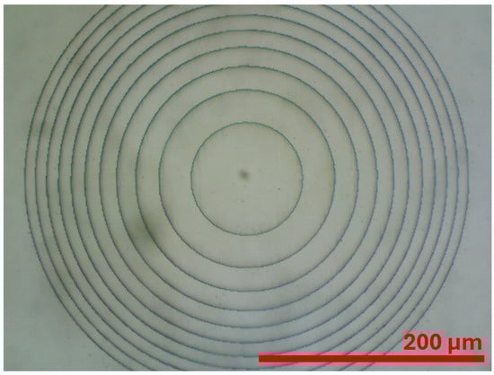 The final step was to prepare the lens array. Four lenses were arranged in a line at different intervals, corresponding to the distances between optical fibers in a V-groove. An optical microscope image of a fabricated lens is shown in Figure 10.