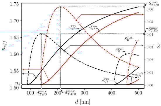 WG films with large-size VGCs were designed and fabricated to demonstrate multichannel operation. The structures had the following parameters: the WG film refractive index and thickness were nf = 1.81 and d= 218 nm, respectively, and the grating period was Λ = 417 nm. This particular WG film thickness was selected because, for this value, the sensitivity of the TM0 mode is at a maximum. The theoretical analysis is displayed in Figure 11, with the characteristics showing variations in the effective refractive index neff and homogeneous sensitivity SH of the WG film’s guided modes. The characteristics of SH(d) were calculated by analyzing the modal characteristics of neff(d). Homogeneous sensitivity is defined by the following equation [27]: