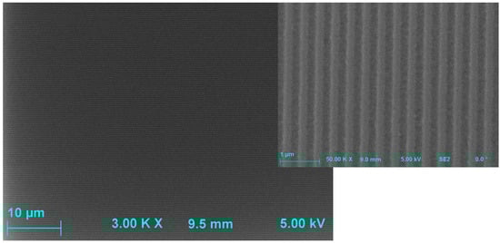 The fabrication process of a VGC in a SiOX:TiOY WG film, as performed in this study, consisted of several steps. In the first step, a sol was synthesized from precursors to SiOX and TiOY. For this purpose, tetraethoxysilane (TEOS) and titanium (IV) ethoxide (TET) were used. In addition, the sol synthesis required deionized water, anhydrous ethanol (EtOH), and hydrochloric acid (HCl). The hydrolysis of the precursors was carried out separately. Then, after the hydrolysis of the precursors was completed, their solutions were mixed. The sol that was used to fabricate the WG films was characterized by a TEOS/TET molar ratio of 1:1 for the silica and titania precursors and a (TEOS + TET)/EtOH/H20/HCl molar ratio of 1:7.23:6.97:0.32. In the next step, sol layers were deposited on clean glass substrates using the dip-coating process. The cleaning procedure involved mechanical washing in deionized water with added TRILUX universal detergent (from Analab, Gliwice, Poland), soaking in a solution of isopropyl alcohol, rinsing in deionized water, rinsing in acetone, and drying. Standard microscopic glass slides (with dimensions of 76 × 26 × 1 mm3) made of SCHOTT BK7 glass (from Pracownia Optyki Instrumentalnej, Warsaw, Poland) or Menzel-Glaser soda–lime glass (from Thermo Scientific, distributed by the company Bionovo, Legnica, Poland) were used. Immediately after the deposition of a sol layer, a VGC was formed by imprinting the pattern engraved in a silicon matrix. Finally, the structures were annealed at a temperature of 500 °C for 60 min. The final thickness of the fabricated WG films varied in the range from ~155 nm to ~230 nm, depending on the value of the substrate withdrawal speed, v.