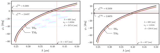 The VGC was imprinted on non-hardened silica–titania film deposited on a BK7 glass substrate of length 76 mm and width 26 mm. The imprinted VGC had a width equal to the substrate’s width. The WG film’s thickness d and refractive index nf were measured on a line parallel to the VGC at two points. The first one lay in the center of the substrate, and the second was approximately 5 mm closer to the substrate’s long edge. The results of those measurements are given next to the lines on two characteristics presented in Figure 13. They are only slightly different. This indicates that the WG layer thickness was uniform in the direction of the VGC. The characteristics present a variation in the in-coupling angle of both fundamental modes with the grating coupler’s period Λ. One can see that both fundamental modes are resonantly excited for positive angles φr by diffraction in the first order on the VGC. The thickness and refractive index of the WG film were measured using a SENTECH SE400adv monochromatic ellipsometer (from Sentech Instruments GmbH, Berlin, Germany).