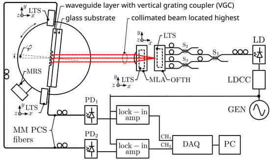 Schematics of the experimental setup for multichannel optical signal coupling to the VGC. DAQ—data acquisition card; GEN—sine wave generator; LD—laser diode; LDCC—laser diode current controller; LTS—linear translational stage; MLA—array of microlenses; MM PCS—multimode plastic-clad silica; MRS—motorized rotational stage; OFTH—optical fiber transmission head; PC—personal computer; PD1, PD2—photodiodes; S1, S2, S3—single-mode fiber optic splitters.