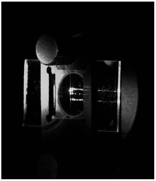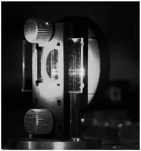 The photonic chip was placed in a dedicated holder mounted on a Thorlabs NR360S (from Thorlabs Inc., Newton, NJ, USA) motorized 360° rotation stage. The chip was oriented so that the light beams excited in the WG film propagated parallel to the chip’s long edge and were received at both opposite chip facets by two multimode PCS fibers having cores of diameter 250 µm. The PCS optical fibers were mounted on linear translational stages, which allowed for fine-tuning of the position of incident beams on the VGC. The light intensity of optical signals received from opposite facets of the chip was converted to an electric voltage by two PDA36A2 silicon photodiodes supported with FEMTO LIA-MV-150 lock-in amplifiers (from Femto Messtechnik GmbH, Berlin, Germany). The characteristics of luminous intensity as a function of the angle of incidence φ were recorded by an NI-6009 data acquisition card (from National Instruments, Austin, TX, USA). The light source in the presented measuring system was a single-mode pigtailed laser diode operating at wavelength λ = 635 nm. Among those at our disposal, this laser operated at the wavelength closest to 633 nm. The light beam generated by the laser was evenly distributed among four single-mode optical fibers, the ends of which were mounted in the optical fiber transmission head (OFTH). The latter is presented in Figure 7. Divergent beams of light emitted from the OFTH were collimated by an array of microlenses (MLA). Both the OFTH and MLA were mounted on linear translation stages. A number of experiments were conducted to verify the proper operation of the designed optical signal distribution system. In the first experiment, for simplicity, the optical signal was delivered via only two optical fibers in a V-groove. The position of the lens array was adjusted appropriately to produce two quasi-parallel beams that illuminated the VGC of the optical chip placed in a holder attached to the rotation stage. The coupling angle was adjusted to optimize the output signal. Figure 13 demonstrates a photograph of a photonic chip mounted in the holder, illuminated at the VGC at the optimal (resonant) coupling angle with two beams separated by approximately 2500 µm.