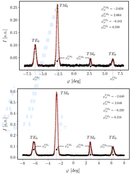 One can also observe two bright streaks, originating at the VGC and reaching the chip end facet, with two even brighter output spots. As already mentioned, to collect the angular characteristics of light intensity coupled into the WG film, a pair of PCS optical fibers were placed near the end facets of the chip on both sides of the VGC. Depending on the orientation of the collimated beam with respect to the normal to the chip, the modes can be excited toward the left-hand (negative φ) or right-hand side (positive φ) of the chip. Each coupled beam was measured separately because the position of the detection PCS fibers at the chip’s edges had to be changed. The coupling characteristics (i.e., the optical signal intensity vs. the coupling angle) of the lower and upper beams are presented in Figure 16.