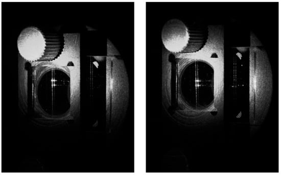 After the optical signal coupling was confirmed, the VGC position was adjusted in height without affecting other settings of the optical path to verify the coupling availability of the VGC along its entire length. Images presenting two collimated beams coupled to the middle and upper sections of the same VGC are shown in Figure 17.
