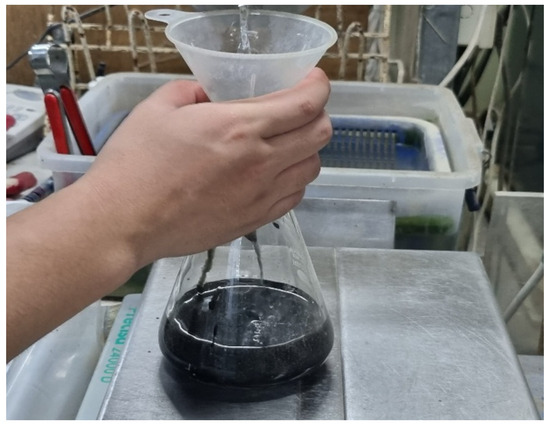 The main properties of the MWCNT powder used in this study are shown in Table 3. Figure 1 shows the appearance of the MWCNT powder used. In addition, Figure 2 is an FE-SEM image of the MWCNT powder, taken at 100,000× magnification. The MWCNT powder used has the form of a bundle with a diameter of 10 to 100 nm, a length of 0.1 to 5 μm, a purity of 96.5 wt.% or higher, a bulk density of 0.08 to 0.12 g/cm3, and an electrical resistivity of 10−3 to 10−6 Ω·cm. When MWCNT powder is directly added during mixing, van der Waals forces are generated, causing entanglement and agglomeration between particles, making even dispersion difficult. The MWCNT dispersion used in this study was purchased in the form of a water-based suspension fabricated by U Company (Confluence, PA, USA), a specialized domestic manufacturer. The MWCNT dispersion was prepared at a concentration of 2.0 wt.% and was stably dispersed through the use of a chemical surfactant and ultrasonic treatment. Figure 3 shows the preparation of MWCNTs relatively evenly dispersed in an MWCNT aqueous solution.