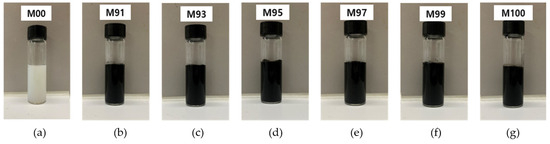 To provide conductivity to the surface of the PET film, 2.0 wt.% of MWCNT was used, and for stable coating, a water-dispersed polyurethane solution (polyurethane dispersion, PUD, solid 40%, particle size < 200 nm, pH 8.0) from Company A (San Clemente, CA, USA) was used. A 2.0 wt.% MWCNT aqueous solution was added to a vial containing an aqueous polyurethane solution at a certain ratio and was mixed at 500 rpm for 10 min to prepare an MWCNT coating solution. Figure 4 is a photograph of a solution mixed with water-dispersed polyurethane at various mixing ratios of MWCNT: 0 wt.%, 91 wt.%, 93 wt.%, 95 wt.%, 97 wt.%, 99 wt.%, and 100 wt.%. The coating solution without MWCNT addition (M00) exhibited a white opaque color, whereas all coating solutions with MWCNT addition exhibited a black color. In particular, since the solution appears evenly black overall, it can be confirmed that the MWCNTs are evenly mixed with polyurethane and can be used as a solution for fabricating MWCNT-coated conductive films.
