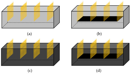 Schematic diagram of various specimens: (a) PCC, (b) MWCNT-coated film, (c) MWCNT dispersion, and (d) MWCNT-coated films and MWCNT dispersion.
