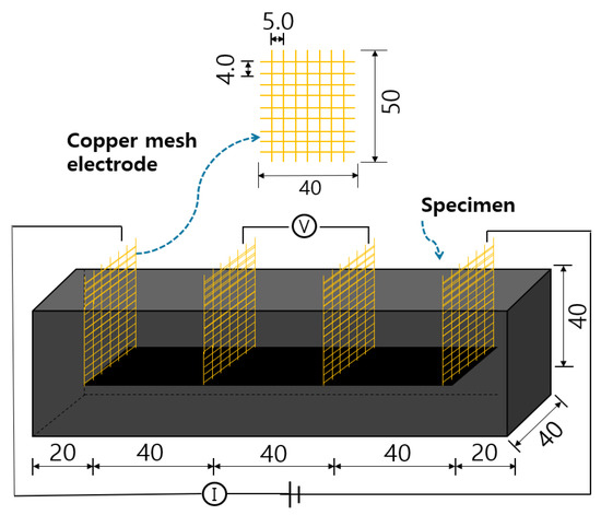 In addition, as shown in Figure 9, the cement composites were embedded in a prism specimen measuring 40 × 40 × 160 mm3 in size with four copper mesh electrodes arranged at regular intervals. Each electrode was placed in a straight line at 40 mm intervals and embedded so that 20 mm protruded from the top of the specimen. Moreover, a copper mesh electrode was used at the contact point between the copper and cement composites to minimize discontinuity between different materials. Additionally, a copper mesh electrode was used at the contact point between the copper and cement composites to minimize discontinuity between different materials.