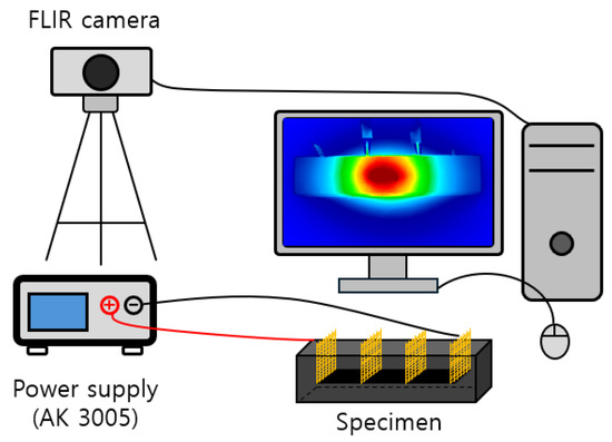 There are no separate domestic or foreign regulations for testing the heating performance and electrical resistance of cement composites. In this study, therefore, specimens measuring 40 × 40 × 160 mm3 were fabricated based on the domestic standard KS L ISO 679 [39] and the international standard ASTM C348 [41]. Figure 10 features the experimental setup for measuring the heating performance of cement composite specimens. The heating performance experiment was conducted by supplying a constant DC voltage to the specimen. In the experiment, clamps were connected to copper mesh electrodes spaced at 40 mm and 120 mm intervals, and various applied voltages (10 V, 20 V, 30 V) were supplied using a power supply (DC power supply, AK3005, Vupower, Yongin, Republic of Korea). Thereafter, the surface temperature was measured at 1-s intervals for 1 h (3600 s) using a thermal imaging camera (Infrared thermal camera, T630sc, FLIR, Wilsonville, OR, USA) while maintaining the initial temperature at 20 ± 0.5 °C. At the same time, the strength of the applied voltages was measured using a digital multimeter, and it was confirmed that a constant voltage was stably supplied. To prevent electric shock and short circuits and ensure safety during the experiment, voltage was supplied while all specimens were placed on the insulated rubber plates.