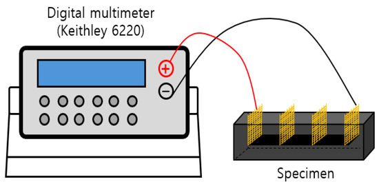 Two-probe and four-probe methods are commonly used to measure the electrical resistance of cement composites. Although the two-probe circuit is simpler, the four-probe method is preferred because the contact resistance between the specimen and the electrodes can affect the measurements [42,43]. Figure 11 shows the experimental setup for measuring the electrical resistance of the cement composite specimens. In the present study, the electrical resistance of cement composites was measured using a digital multimeter (Keithley 6220, Keithley Instruments from Solon, Ohio, USA). The four-probe method was used for the measurement, and the electrodes of the films in the cement composites were connected using four probes, and then a voltage was applied. Afterwards, the electrical resistance value was measured according to the current and voltage changes flowing through the films. In order to obtain reliable electrical resistance data, each experimental variable was measured twice, and the average value was used to gain the data.