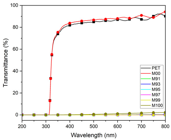 Figure 12 shows the transmittance of MWCNT-coated conductive films prepared with MWCNT at various mixing ratios. While the uncoated PET film and the M00 sample coated only with urethane showed high transmittance of about 86% in the visible light range, all MWCNT-coated conductive films showed transmittance of 0% in the visible light range. This indicates that MWCNTs were evenly formed as an MWCNT coating layer on the surface of the PET film.