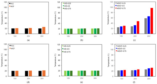 Figure 15 is a graph showing the maximum temperature measurement results of cement composites according to various applied voltages and different electrode spacings. Figure 15a displays the results of comparing the maximum temperatures of the PCC specimen without either MWCNT dispersion or MWCNT-coated film, and the MCF specimen with only MWCNT-coated films at various applied voltages and an electrode spacing of 40 mm. While the PCC specimen showed almost no temperature increase as the applied voltage increased, the MCF specimen showed a slightly higher heating effect, with a temperature increase of approximately 5.8 °C at an applied voltage of 30 V. Figure 15b shows the results comparing the maximum temperatures of the MD specimens using only MWCNT dispersion at various applied voltages and an electrode spacing of 40 mm. When the applied voltage was 30 V, the MD-0.25 specimen showed a temperature increase of 0.4 °C, the MD-0.50 specimen showed a temperature increase of 0.7 °C, and the MD-0.75 specimen showed a temperature increase of 1.0 °C. Even when the applied voltage was 30 V, the heating performance of the cement composites was not significantly improved. This indicates that it is difficult to effectively improve the self-heating properties of the cement composites using only MWCNT dispersion. Figure 15c displays the results of comparing the maximum temperatures of MDCF specimens using both MWCNT dispersion and MWCNT-coated films at various applied voltages, with an electrode spacing of 40 mm. When the applied voltage was 30 V, the MDCF-0.25 specimen showed a temperature increase of 38.5 °C, the MDCF-0.50 specimen featured a temperature increase of 45.7 °C, and the MDCF-0.75 specimen indicated a temperature increase of 77.1 °C. At the same applied voltage of 30 V, particularly, the MDCF-0.75 specimen using both the 0.75 wt.% MWCNT dispersion and MWCNT-coated film showed a temperature increase that was approximately 77.1 times higher than that of the MD-0.75 specimen using only MWCNT dispersion at the same concentration, and approximately 13.3 times higher than that of the MCF specimen using only MWCNT-coated film. This shows that the heating performance can be further improved when both MWCNT dispersion and MWCNT-coated films are used, and it is analyzed that the conductive coating films facilitate the flow of current, thereby generating heat more efficiently. Using both, the heating performance becomes more uniform and optimized, and it tends to maintain a temperature above a certain level even at a low voltage of 20 V, suggesting its potential as an energy-efficient heating material. Figure 15d indicates the results of comparing the maximum temperatures of the PCC specimen without either MWCNT dispersion or MWCNT-coated film, and the MCF specimen with only MWCNT-coated films at various applied voltages and an electrode spacing of 120 mm. In all specimens, the temperature increase was minimal despite the various changes in applied voltage, confirming that there was no significant difference in heating performance. Figure 15e shows the results comparing the maximum temperatures of the MD specimens using only MWCNT dispersion at various applied voltages and an electrode spacing of 120 mm. When the applied voltage was 30 V, the temperature increase was 0.1 °C for the MD-0.25 specimen, 0.2 °C for the MD-0.50 specimen, and 0.3 °C for the MD-0.75 specimen, indicating that there was almost no temperature increase. This means that the specimen with an electrode spacing of 120 mm had relatively lower heating performance than the specimen with an electrode spacing of 40 mm. Figure 15f displays the results of comparing the maximum temperatures of MDCF specimens using both MWCNT dispersion and MWCNT-coated films at various applied voltages and an electrode spacing of 120 mm. When the applied voltage was 30 V, the temperature increase was 6.1 °C in the MDCF-0.25 specimen, 10.1 °C in the MDCF-0.50 specimen, and 12.3 °C in the MDCF-0.75 specimen, respectively. Moreover, the heating performance was relatively low in the Group 4 specimens with an electrode spacing of 120 mm. When comparing the temperature increase according to different electrode spacings, the MDCF-0.25 specimen turned out to be 32.4 °C, the MDCF-0.50 specimen showed 35.6 °C, and the MDCF-0.75 specimen featured the highest temperature increase at 64.8 °C. This may be analyzed as being because the closer the electrode spacing, the more smoothly the current flows through the shortest distance, reducing the electrical resistance, and as a result, the temperature of the cement composites increases further.