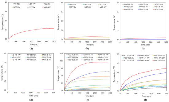 Figure 16 is a graph revealing the change in surface temperature over time of the cement composites. Figure 16a,b show the change in surface temperature of the PCC specimen and the MCF specimen using only MWCNT-coated film in the PCC under various applied voltages and different electrode spacings. In the case of the PCC specimen, the temperature increase was not large even when the applied voltage increased, and overall, a minimal temperature increase was observed. This is analyzed as being due to the low conductivity of the PCC itself. In addition, the heating performance was not significantly improved in the MCF specimen using only MWCNT-coated film, and a similar level of temperature increase was observed in both cases where the electrode spacing was 40 mm and 120 mm. This seems to be because there is a limit to forming a sufficient conductive network using only MWCNT-coated films. Figure 16c,d show the surface temperature changes of the MD specimen that uses only MWCNT dispersion in the PCC. Even in this case, the difference in heating performance when the electrode spacing was 40 mm and 120 mm was not significant, and the temperature increase tended to remain low over time. This suggests that it is difficult to sufficiently secure heating performance by using only MWCNT dispersion. In addition, even when the MWCNT concentration increased, there was no significant difference in the temperature gradient, and it tended to maintain a constant temperature after reaching the peak. Figure 16e,f reveal the surface temperature changes of the MDCF specimen using both MWCNT dispersion and MWCNT-coated films in the PCC. The temperature gradient and final temperature varied depending on the mixing method used. The temperature gradient was relatively high compared to that of specimens using only MWCNT dispersion or only MWCNT-coated films. This is analyzed as a result of MWCNT being evenly dispersed in an aqueous solution in the PCC, forming a conductive network with the coating films, thereby improving thermal conductivity and increasing temperature and heat diffusion. It increased as the MWCNT concentration increased, and the temperature stabilized when it reached the maximum temperature. In particular, when the electrode spacing was 40 mm, the temperature gradient was steeper than when the electrode spacing was 120 mm. This is analyzed to be because the narrower the electrode spacing, the smoother the current flows within the composite, leading to a relatively higher temperature increase. Therefore, the analysis results found that the heating performance of the PCC itself is very low, and the heating effect is not significant even when only coating films or dispersion of MWCNT is used. However, it was confirmed that when both MWCNT-coated films and dispersion of MWCNT were used, the heating performance was significantly improved, and the temperature increase tended to be higher as the electrode gap narrowed. It seems thus necessary to use both MWCNT dispersion and MWCNT-coated films in order to secure effective heating performance, and the optimization of the electrode gap is also considered an important factor.