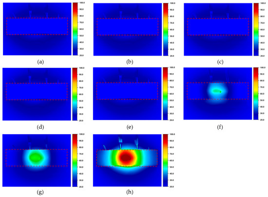 Thermal images of specimens with 40 mm spacing between electrodes under an applied voltage of 30 V: (a) PCC (20.2 °C), (b) MCF (25.8 °C), (c) MD-0.25 (20.4 °C), (d) MD-0.50 (20.7 °C), (e) MD-0.75 (21.0 °C), (f) MDCF-0.25 (58.5 °C), (g) MDCF-0.50 (65.7 °C), and (h) MDCF-0.75 (97.1 °C). Red dashed boxes highlight the regions of interest where temperature measurements were focused.